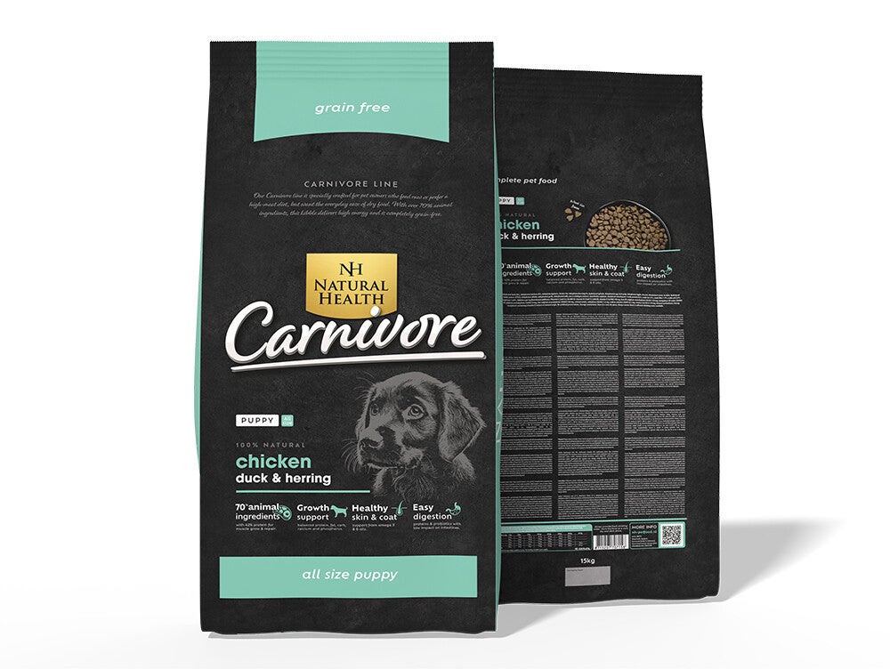 Natural Health Carnivore heeft een laag percentage zetmeel, een hoog percentage eiwit en is vrij van granen. Net als bij mensen, geeft een overvloed aan hoogcalorie koolhydraten een verhoogde kans op overgewicht, diabetes en een algehele lusteloosheid. Op dit moment hebben de meeste hondenvoeders nog steeds graan en graanbijproducten als basis van hun voeding.