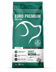 EURO PREMIUM Adult Medium - Chicken & Rice is een volledige, super-premium voeding voor volwassen honden van middelgrote rassen (vanaf 1 jaar en 10 - 25kg volwassen gewicht). Een optimale weerstand en een gezonde spijsvertering worden ondersteund door de toevoeging van een unieke blend van plantenextracten - rijk aan antioxidanten - aangevuld met prebiotica en ?-glucanen. Een optimale verhouding Omega-3 / Omega-6 vetzuren bevordert een gezonde huid en glanzende vacht. Kip, de belangrijkste bron van dierlijke eiwitten, draagt bij tot sterke spieren. Samengesteld met rijst in plaats van glutenbevattende granen om tegemoet te komen aan honden met een glutenintolerantie.
