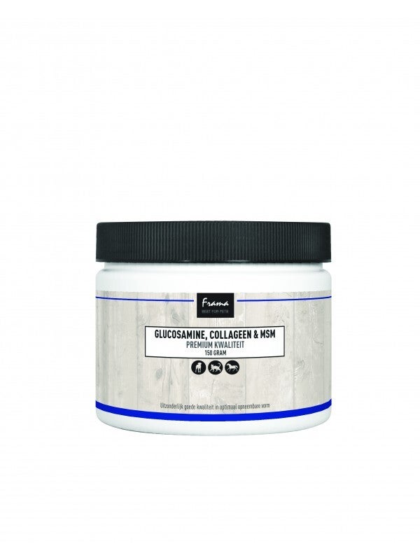 Frama Best for Pets Glucosamine, Collageen & MSM bevat een glucosamine-kwaliteit van speciale schaaldieren, de gebruikte Collageen is van Runder-kwaliteit, hierdoor bevat het dus van beiden één van de beter verkrijgbare kwaliteiten. De Collageen Peptiden zijn Type I Collageen Peptiden. De Collageen Peptiden werden geoptimaliseerd voor een snelle biologische beschikbaarheid en activiteit, en hun gehydrolyseerde vorm zorgt voor een gemakkelijke vertering en een excellente absorptie; ze bevatten aminozuren, de bouwstenen van onze weefsels en de hoofdcomponent van proteïnen.
