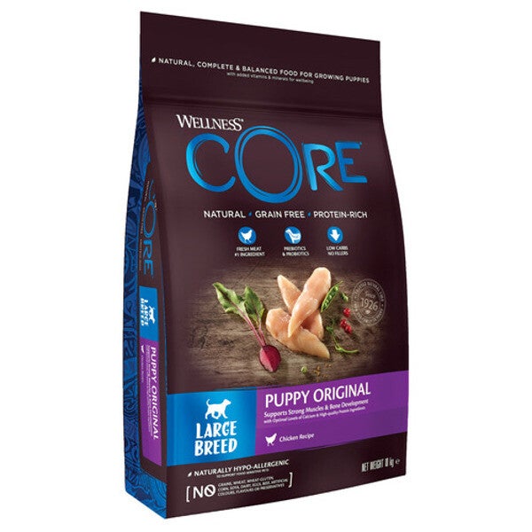 Wellness CORE Large Breed Puppy Original ondersteunt de ontwikkeling van sterke spieren en botten dankzij een optimaal calciumgehalte & hoogwaardige eiwitten. Onze Large Breed Puppy Original werd samengesteld om nutritionele ondersteuning te bieden aan een evenwichtige ontwikkeling van de spieren en het skelet van puppy's van grote rassen. Een speciaal aangepaste dosis aan calcium en fosfor gecombineerd met perfect evenwichtige ingrediënten helpt het beheer van de groei te vergemakkelijken, wat cruciaal is voor de goede ontwikkeling van puppy's van grote rassen. Eiwitten, vetten, koolhydraten en calorieën zijn perfect evenwichtig om een grote puppy te voorzien met de energie en voeding die hij nodig heeft om te verzekeren dat hij naar zijn volle potentieel zal groeien voor de beste start in het leven.