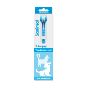 Speciale 3-koppige tandenborstel om het gebit van honden & katten te reinigen. USP’s i.c.m. de Sanimal Tandpasta: • Ondersteunt gezond tandvlees en schone tanden, • Helpt tandplak en mondbacteriën te verminderen (antibacteriële werking), • Draagt bij aan een frisse adem. Wat is het? Met deze speciale 3-koppige tandenborstel kun je aan 3 zijden van elke tand & kies tegelijk poetsen. Geschikt voor een effectieve reiniging en aanpak van tandplak vanuit elke hoek, ook de moeilijk bereikbare plekken in de mond! Voor wie is dit product geschikt? Een stinkende adem is bij honden en katten een veel voorkomend probleem. In veel gevallen van een stinkende hondenadem of stinkende kattenadem komt dit door gebitsproblemen die veroorzaakt kunnen worden door bacteriën. Door het gebit goed te onderhouden met speciale producten voor honden en katten, kun je zorgen voor een gezonde mondhygiëne. Dit kun je onder meer doen door het poetsen van de tanden met de 3-koppige Sanimal Tandenborstel, i.c.m. de Sanimal Tandpasta. Wijze van gebruik: 1. Laat jouw huisdier eerst kennis maken met de tandenborstel door hem/haar er eerst aan te laten snuffelen. 2. Bij gebruik van de Sanimal Tandpasta: breng de tandpasta aan op de 3-koppige Sanimal Tandenborstel en poets rustig en grondig het hele gebit. Toepassing Reinig het gebit dagelijks om een optimaal resultaat te behalen. Doe dit bij voorkeur na een maaltijd. De tandenborstel na 3 maanden vervangen, of eerder bij slijtage. Verwijderen De kartonnen verpakking bij het oud papier, het plastic van de verpakking bij het plastic afval en de tandenborstel bij het restafval. LET OP! Raadpleeg je dierenarts als je dier pijnlijk ontstoken tandvlees of aanhoudende gebitsproblemen heeft. Waarschuwingen Niet voor menselijk gebruik. Altijd buiten het zicht & bereik van kinderen houden. TIP! Naast het tandenpoetsen met de 3-koppige Sanimal Tandenborstel & Sanimal Tandpasta kun je het katten- of hondengebit ook verzorgen met het Sanimal Mondwater. Dit product bevat het natuurlijke ingrediënt granaatappelextract, dat tandplak en mond bacteriën helpt verminderen. Bekijk ook onze handige uitlegvideo: https://www.emax.nl/product/sanimal-tandenborstel/ TIP! Gebruik ook de andere Sanimal producten voor een optimale verzorging van je huisdier.