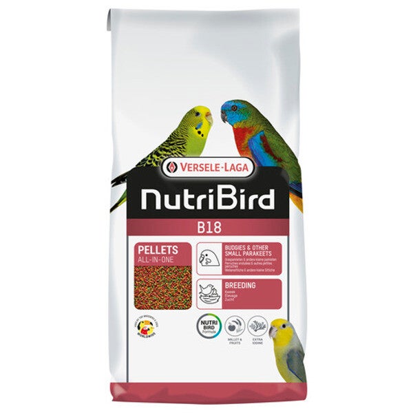 In de natuur zoeken vogels naar de voedingsstoffen die ze op dat moment nodig hebben. In gevangenschap ben jij degene die jouw vogel voorziet van de juiste voedingsstoffen, daarom is de juiste voeding héél belangrijk! B18 Parkiet kweekvoer van Versele-Laga Nutribird is een volledig vogelvoer. Deze pellets bevatten alle noodzakelijke voedingsstoffen voor een evenwichtige gezonde voeding en voorkomt selectief eetgedrag. De pellets bevatten natuurlijke kleimaterialen en prebiotica voor een gezonde darmflora en optimale vertering. Daarnaast bevat het de optimale eiwit- en calciumgehalte voor uitstekende kweekresultaten. Ook zal het verenpak prachtig stralen door alle aanwezige voedingsstoffen!