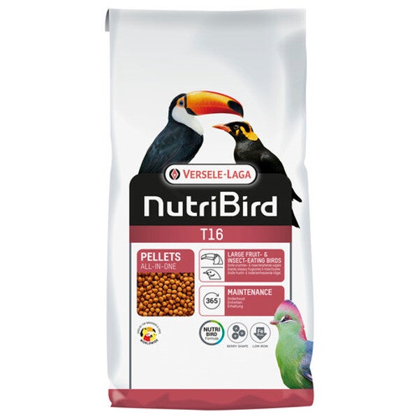In de natuur zoeken vogels naar de voedingsstoffen die ze op dat moment nodig hebben. In gevangenschap ben jij degene die jouw vogel voorziet van de juiste voedingsstoffen, daarom is de juiste voeding héél belangrijk! T16 Toekan onderhoudsvoer van Versele-Laga Nutribird is een volledig vogelvoer voor o.a. beo's, toekans, toerako's en fruitduiven . Deze pellets bevatten alle noodzakelijke voedingsstoffen voor een evenwichtige gezonde voeding en voorkomt selectief eetgedrag. De pellets bevatten natuurlijke kleimaterialen en prebiotica voor een gezonde darmflora en optimale vertering. Daarnaast bevat het de optimale calcium- fosforverhouding voor een gezond skelet. Ook zal het verenpak prachtig stralen door alle aanwezige voedingsstoffen!