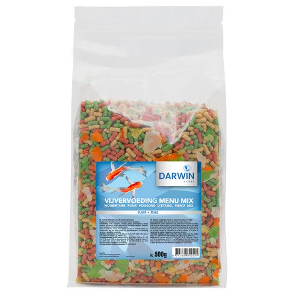 Volledige diervoeder voor alle soorten vijvervissen. Darwin Vijvervoeding menu mix is een zeer gevarieerde licht verteerbare mix van vlokken, sticks, korrels en Gammarus. Deze mix bevat alle essentiële voedingstoffen, vitaminen, mineralen en sporenelementen die jouw vissen nodig hebbenDe hoge verteerbaarheid zorgt voor een geringe waterbelasting en verbeterde waterkwaliteit. Verwijder de voeding die niet wordt opgegeten. Het is geschikt voor alle soorten vijvervissen, zoals goudwindes, goudvissen, karpers en andere karperachtigen. Darwin voeding draagt bij aan een lang en gezond leven van je vissen.