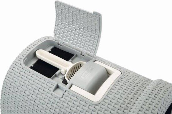 De overige 5% zijn nieuwe grondstoffen. De hele kattenbak is op zijn beurt ook weer 100% recyclebaar. De kattenbak heeft een modieuze uitstraling doordat het een motief heeft van gevlochten rattan.