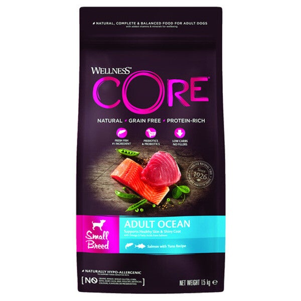 Onze Wellness CORE Small Breed Adult Ocean werd ontwikkeld om een gezonde huid en glanzende vacht te bevorderen met omega 3-vetzuren uit zalm. Naast graanvrij en eiwitrijk te zijn, heeft onze Wellness CORE Small Breed Adult Ocean verse zalm als het n°1 ingrediënt. Een natuurlijk recept met hoogwaardige eiwitten uit vis, samen met een unieke combinatie van gezonde groenten en superfoods, waarbij vulstoffen en granen worden weggelaten. Wellness CORE Small Breed Adult Ocean is een gevogeltevrij recept en is perfect voor honden die nood hebben aan een andere eiwitbron, of voor gevoelige honden die geen gevogelte kunnen eten.
