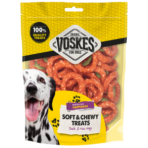Verras je hond met deze heerlijke Voskes Eend & Rijst Ringen. Deze onweerstaanbare traktatie is makkelijk verteerbaar & vetarm. Ideale verwensnack voor jouw kwispelende huisgenoot!