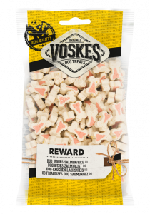 Voskes Training Treats met zalm & rijst zijn heerlijke, zachte hondensnoepjes in de vorm van een botje. Deze traktatie zonder toegevoegde suiker is perfect tijdens de training maar is ook geschikt om je viervoeter te belonen voor goed gedrag of gewoon als lekker tussendoortje.