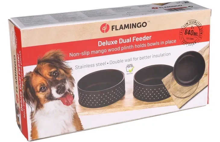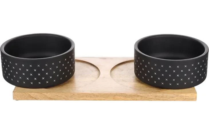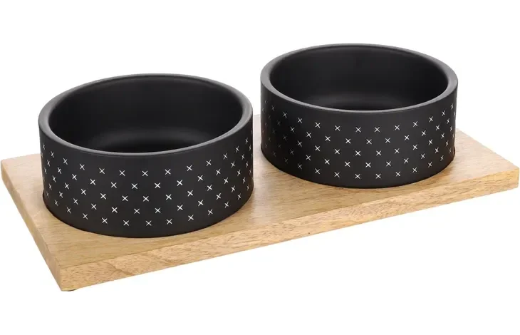 Deze coole eetpot met dubbele wand houdt het eten van je harige vriend langer fris. Inclusief 2 inox potten in een handige houten houder. Vaatwasmachinebestendig!