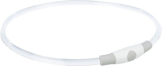 De Trixie Halsband USB Flash Light Lichtgevend Oplaadbaar Multi L-XL 65X0,8 cm is een lichtgevende halsband voor de hond, met knipper of constant-functie, spatwaterbestendig en gemakkelijk op maat te maken. Jij hoeft niet meer bang te zijn dat jouw hond 's avonds of tijdens grauwe dagen niet meer goed zichtbaar is met deze halsband van Trixie. Deze halsband is gemaakt van kunststof/TPU, waardoor hij gemakkelijk op maat te knippen is. De halsband is rondom verlicht en je kunt kiezen tussen knipperlicht (14 branduren) en continue-licht (6 branduren). Deze variant heeft een aanvullende modus om de drie kleuren licht (rood, groen en blauw) te doorlopen. Na gebruik kun je de halsband opladen met de meegeleverde USB-kabel. De halsband is spatwaterbestendig en dus ook geschikt voor regenachtige dagen. Met een zichtbaarheid tot wel 200 meter!