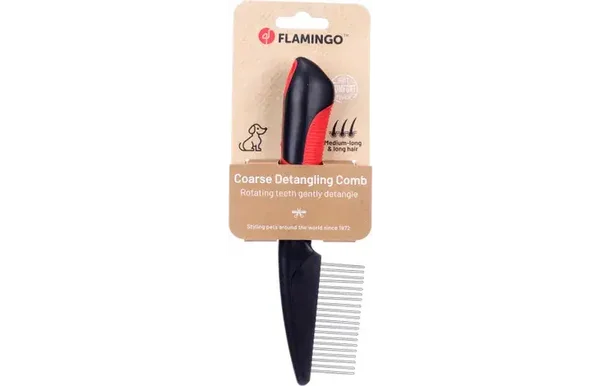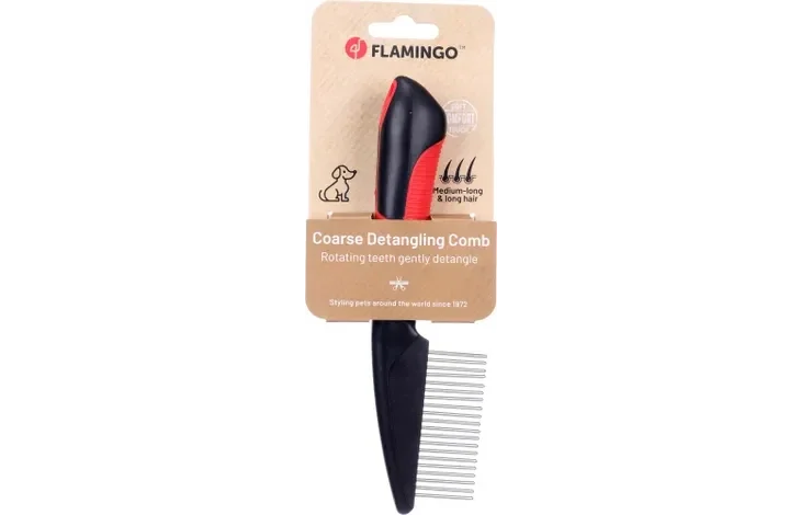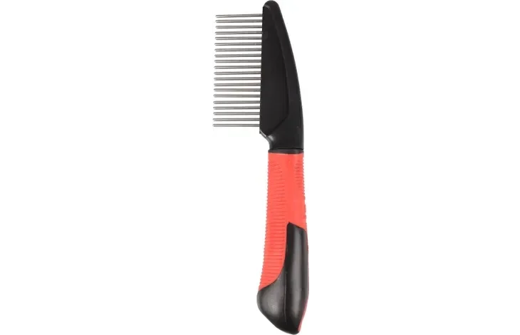 Bye bye klitten! Met deze kam met roterende tanden en handvat wordt het ontwarren van knopen in de vacht van je hond een fluitje van een cent. De afgeronde tanden beschermen de huid en het rubberen handvat zorgt voor een stevige grip. Geschikt voor middellange en lange vachten.