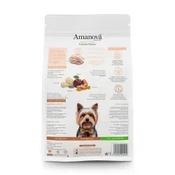Amanova Adult mini met verse kip als hoofdingrediënt is een hypoallergene voeding voor volwassen honden van een kleine rassen. Dit voer onderscheidt zichzelf omdat er alleen vers vlees wordt gebruikt in plaats van vleesmeel of gedroogd vlees zoals bij veel soorten voer gebeurd. Kip is meteen ook de enige dierlijke bron in de voeding, verder bevat dit voer een uitgebalanceerde mix van biologische eiwitten die op de juiste momenten ondersteunt in de ontwikkeling van je hond en het in stand houden van een sterk spierstelsel bevorderd.