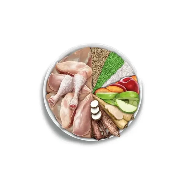 Vers bereide kip 71% (we gebruiken 140 kg vers bereide kip om 100 kg van ons product te verkrijgen), hele groene erwten, bruine rijst, appelvezels, gehydrolyseerde kippenlever, gist (Saccharomyces cerevisiae), eiwitrijst, mineralen, visolie (beschermd met natuurlijke tocoferolen), glucosamine 1400 mg/kg, gedroogde pompoen, quinoa 1000 mg/kg, gedroogde broccoli, gedroogde boerenkool, Antarctische krill, kelp, cranberry, spirulina, gember, rode pruimen 1000 mg/kg, gehydrolyseerde gistcelwand (bron van MOS) 1000 mg/kg, cichorei (bron van FOS) 1000 mg/kg, kurkuma 1000 mg/kg, chondroïtine 1000 mg/kg, witte wortel 1000 mg/kg kg, rozemarijn, yucca schidigera.