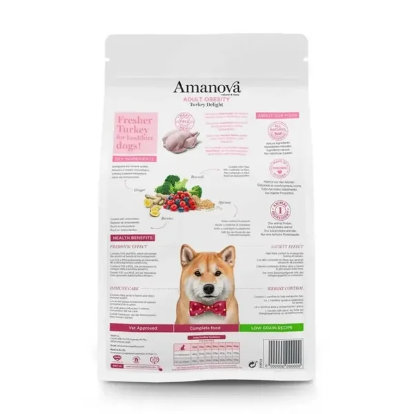 Amanova Adult Obesity Turkey Delight is een vetarme voeding voor volwassen honden. Als enige dierlijke bron is alleen verse kalkoen gebruikt. Voor deze bron is gekozen omdat het smakelijk vlees is dat rijk is aan eiwitten, een laag percentage vet bevat en laag is in cholesterol. Kalkoen is ook makkelijk verteerbaar mager vlees dat de spierontwikkeling bevordert.