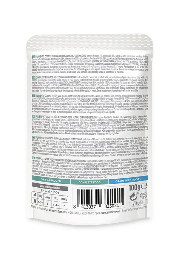 Ingredienten; vers rund 64%, wortel 5%, aardappel 2,50%, mineralen, lijnzaad (natuurlijke bron van omega - 3 vetzuren) 0,03%, glucosamine 300 mg/kg, inuline (bron van FOS) 0,02%, gehydrolyseerde gistcelwand (bron van MOS) 0,02%, chondroïtine 215 mg/kg, goudsbloem 100 mg/kg, kruidnagel 100 mg/kg, rozemarijn.