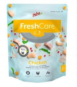 FreshCare Chicken is een compleet rauw menu met kip voor alle honden, van pup tot senior. De voeding bevat 83% kip en verse groenten en fruit die de voor een goede darmflora onontbeerlijke vezels leveren. De voeding is verkrijgbaar in worsten van 1 kilo of in zakjes van 750 gram met 50 grams schijfjes.