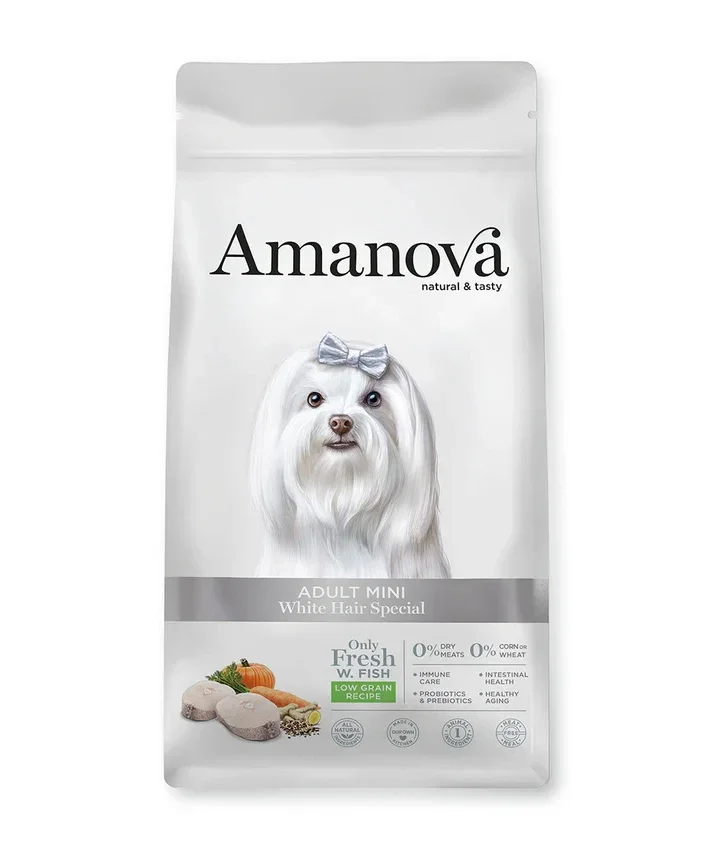 Amanova Adult Mini White Hair Special is een complete en natuurlijke voeding voor volwassen honden van kleine rassen met een witte of lichtgekleurde vacht.