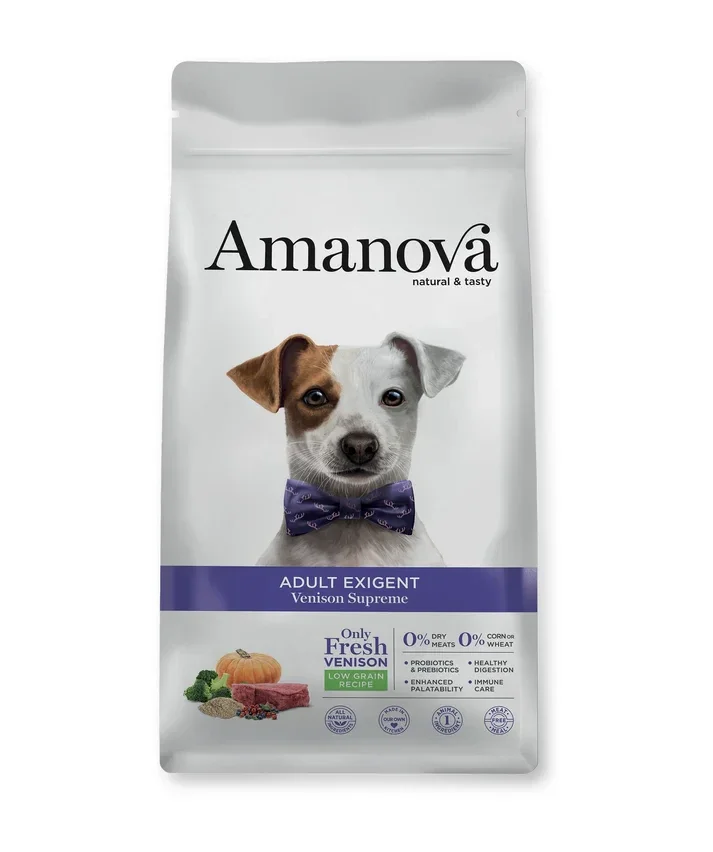 Amanova Adult Exigent Venison Supreme is een premium hondenvoer, speciaal ontwikkeld voor volwassen honden van alle rassen, en ontworpen om de meest veeleisende smaakpapillen te veroveren. Het is bereid met 67% vers hertenvlees als de enige bron van dierlijke eiwitten, waardoor de unieke smaak en herkenbare geur het de ideale keuze maken voor honden met verfijnde smaak.