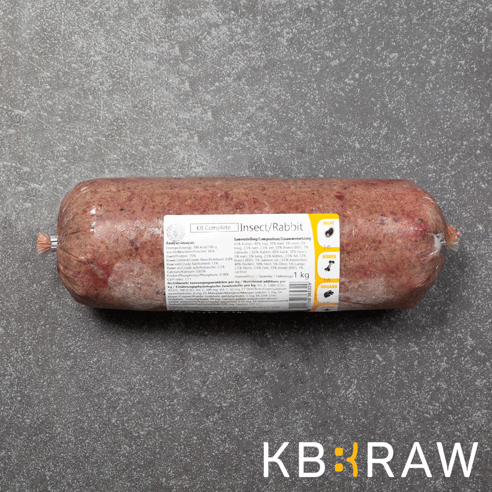 Samenstelling; 65% Konijn; 40% rug, 10% hart, 5% oren, 5% long, 2,5% nier, 2,5% vet, 33% Insect (BSF), 1% Zalmolie, 1% Vitamines en mineralen.